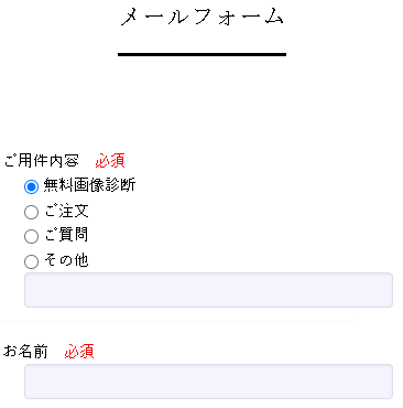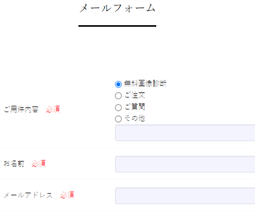 メニューの『お問い合わせ』から、メールフォームに移動します。順に必須項目の入力を行います。 ご用件欄は、『無料画像診断』を選択してください。